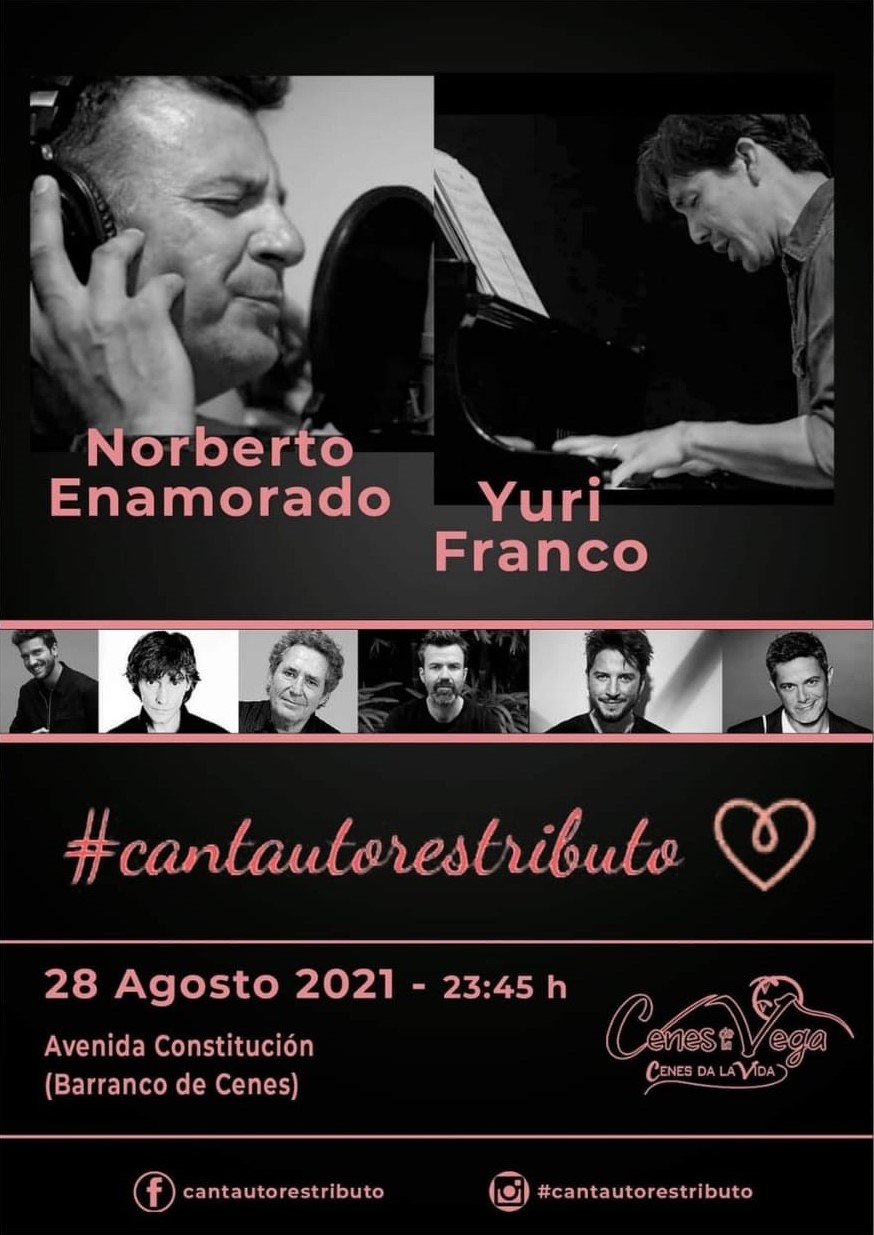 Desde la intención de #cantautorestributo, se busca revivir de nuevo el concierto en vivo, rindiendo un homenaje a grandes cantautores de la talla de Alejandro Sanz, Joan Manuel Serrat, Pablo Alborán, Antonio Vega, Miguel Ríos, Manuel Carrasco, Pau Donés… en un formato acústico de la mano del vocalista Norberto Enamorado con más de veinticinco años de experiencia y del pianista Yuri Franco, productor y director musical en el Talent Show “La Voz”. Juntos crearán un ambiente de participación y disfrute del público contando en todo momento con las medidas higiénico-sanitarias frente al covid19.